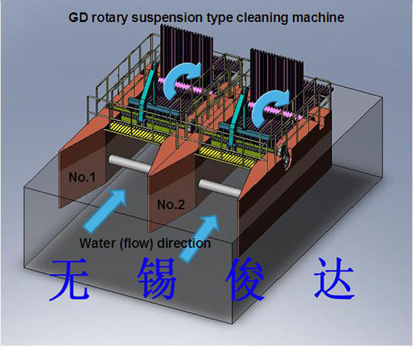 Rotary suspension type cleaning machine is one of trash removal equipment applied in the works of power station, urban sewage treatment, urban water supply, water diversion from channels and rainwater pump station, etc. The cleanin g machine is mainly used to intercept the household wastes including algae organisms, tree branches, leaves, plastic products, foams and bottles, etc. that float on water. The cleaning machine is designed in modular structure and can be directly applied on channel plate brakes (and can be connected in assembly with buoyant boxes if watercourses are wider).