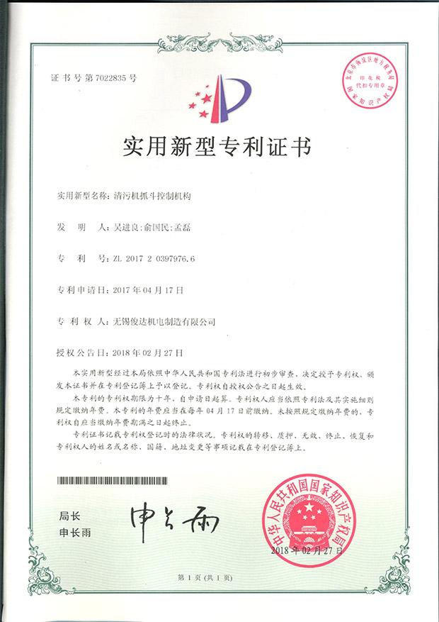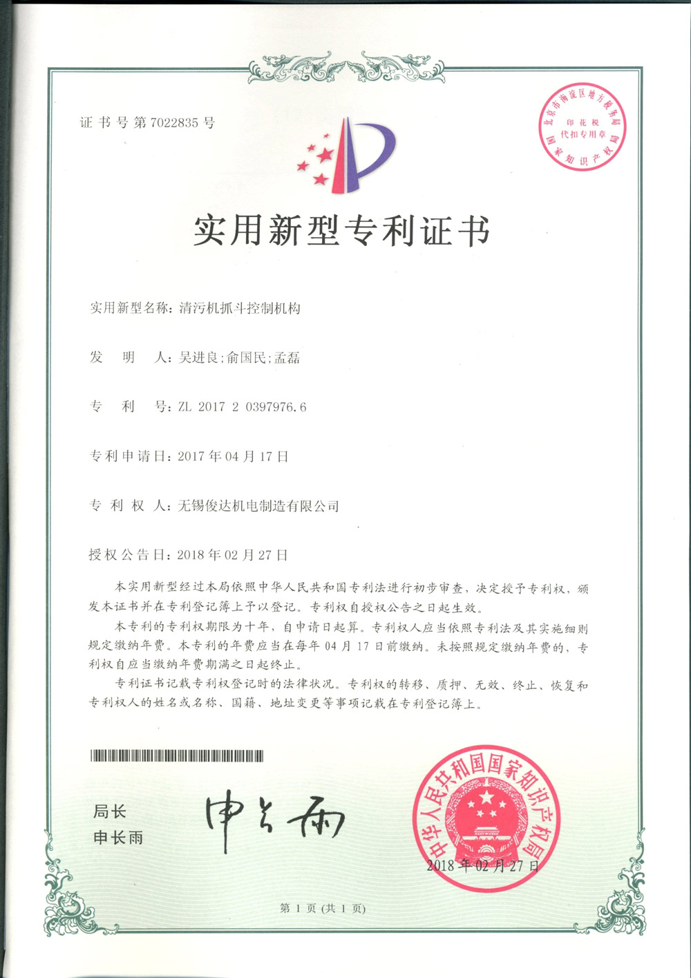 挖耙式旋轉(zhuǎn)清污機(jī)專(zhuān)利證書(shū)
